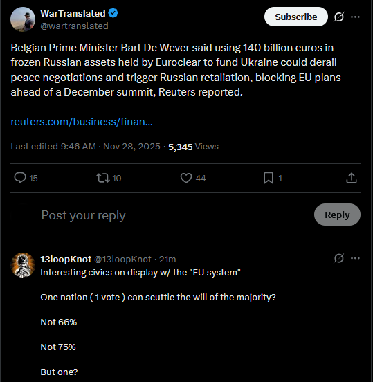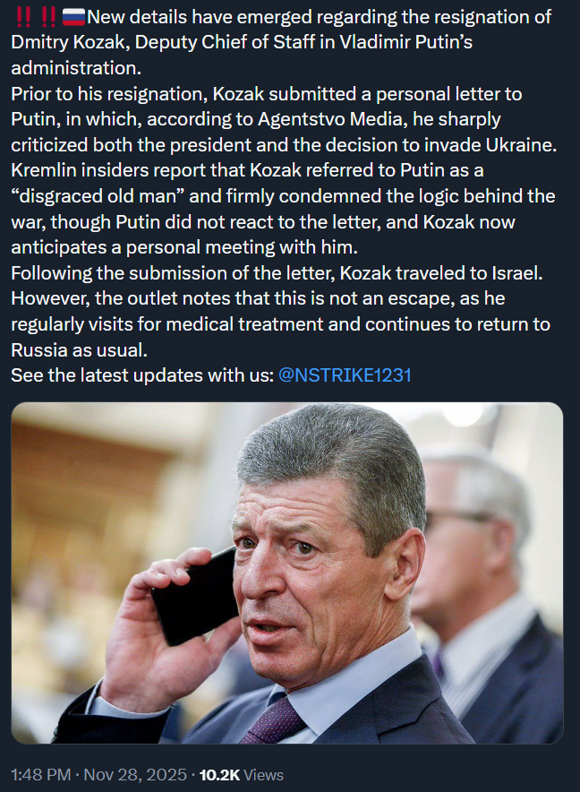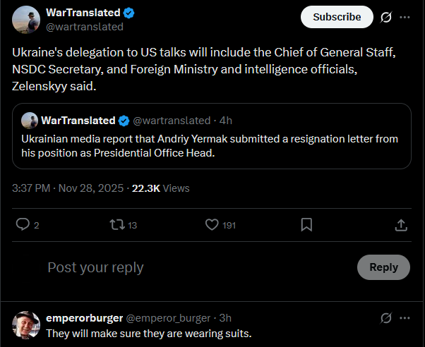 Ukraine's delegation to US talks will include the Chief of General Staff, NSDC Secretary, and Foreign Ministry and intelligence officials, Zelenskyy said.https://x.com/wartranslated/status/1994430396566507880?s=20