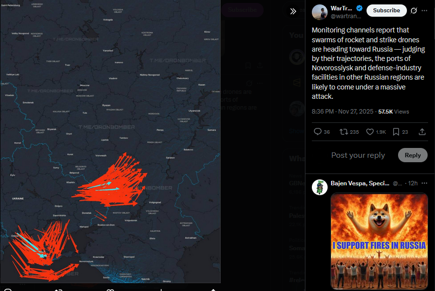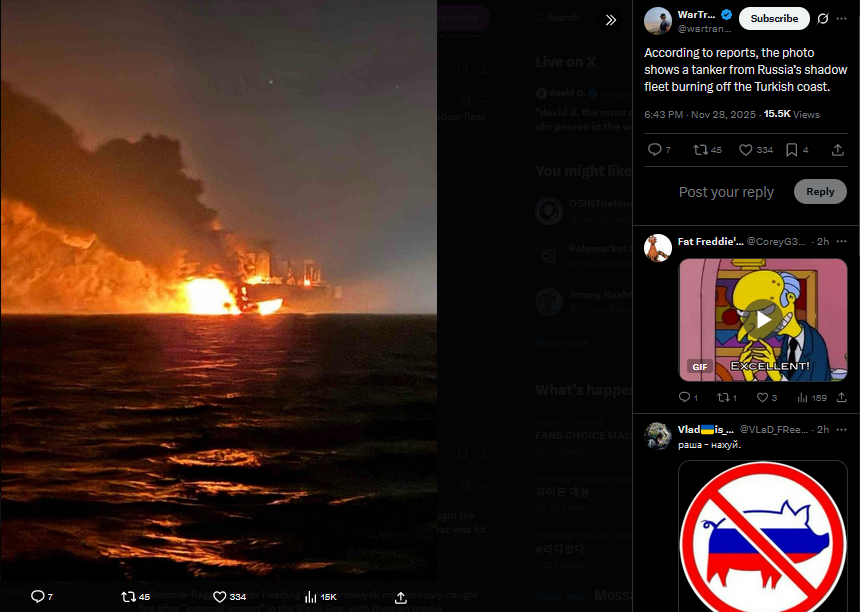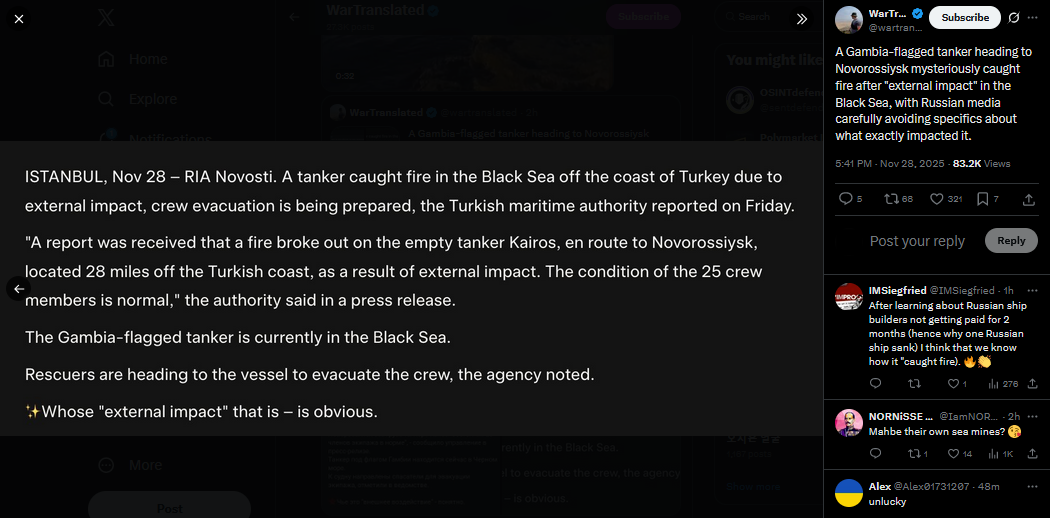 A Gambia-flagged tanker heading to Novorossiysk mysteriously caught fire after "external impact" in the Black Sea, with Russian media carefully avoiding specifics about what exactly impacted it.https://x.com/wartranslated/status/1994461753002922165?s=20pic 1https://files.catbox.moe/w2u1x5.jpgpic 2https://files.catbox.moe/xys0a7.jpg