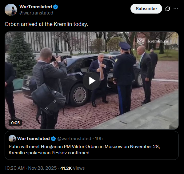 >>522449651>Monke Ball statusPutin and Orban wrapped up their three-hour chat session in the Kremlin.https://x.com/wartranslated/status/1994417488109375494?s=20https://files.catbox.moe/zvnnk5.mp4