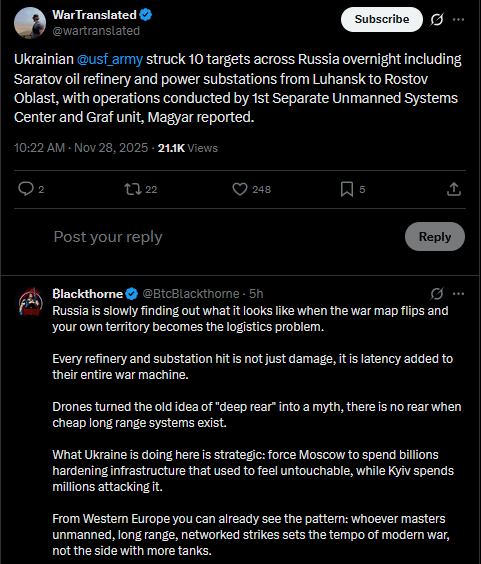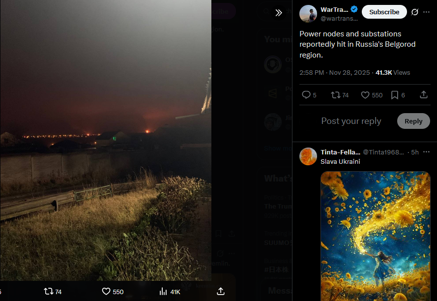 Power nodes and substations reportedly hit in Russia's Belgorod region.https://x.com/wartranslated/status/1994420603118297534?s=20