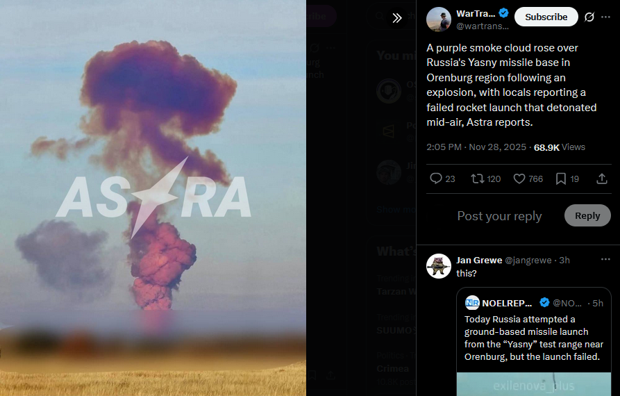 >>522450447UPD: Footage shows the moment the rocket crashed after launch at Russia's Yasny missile base.https://x.com/wartranslated/status/1994416881680216512?s=20https://files.catbox.moe/0mizh7.mp4