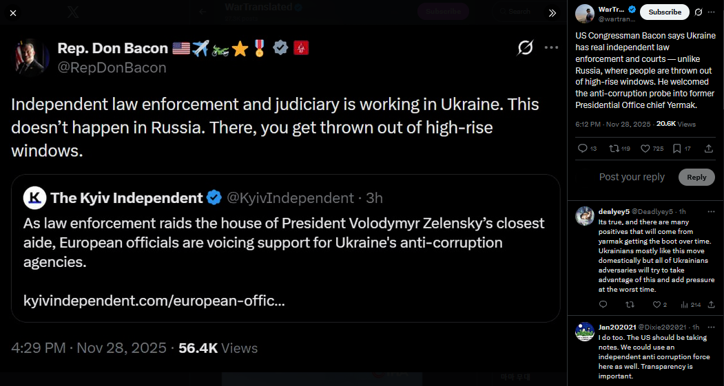 >>522450843US Congressman Bacon says Ukraine has real independent law enforcement and courts — unlike Russia, where people are thrown out of high-rise windows. He welcomed the anti-corruption probe into former Presidential Office chief Yermak.https://x.com/wartranslated/status/1994469453321363843?s=20