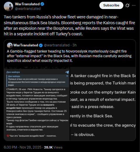 >>522451122>>522451233Two tankers from Russia’s shadow fleet were damaged in near-simultaneous Black Sea blasts. Bloomberg reports the Kairos caught fire after an explosion near the Bosphorus, while Reuters says the Virat was hit in a separate incident off Turkey’s coast.https://x.com/wartranslated/status/1994474031907541483?s=20
