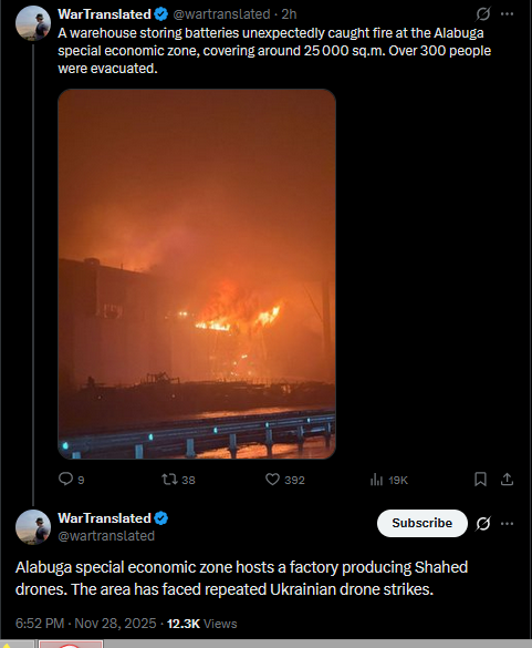 >>522440750A warehouse storing batteries unexpectedly caught fire at the Alabuga special economic zone, covering around 25000 sq.m. Over 300 people were evacuated.https://x.com/wartranslated/status/1994479059875799486?s=20Alabuga special economic zone hosts a factory producing Shahed drones. The area has faced repeated Ukrainian drone strikes.https://files.catbox.moe/qn3rdb.jpg