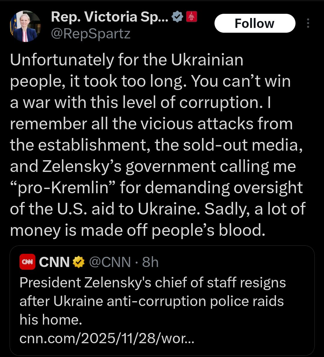 Spent the weekend with some of my ukrainian friends. They are pretty much completely demoralized and acknowledge that their government is highly corrupt and the war is completely pointless and a lost cause. One of the funniest things is how some people they know try to go back and visit and then get detained because they have dual citizenship in ukraine and the US and then get immediately deployed to the front. Some of Ukraine’s biggest supporters are ukrainian diaspora who admit they don’t want to go back because they’d get drafted. It’s so hypocritical and sad