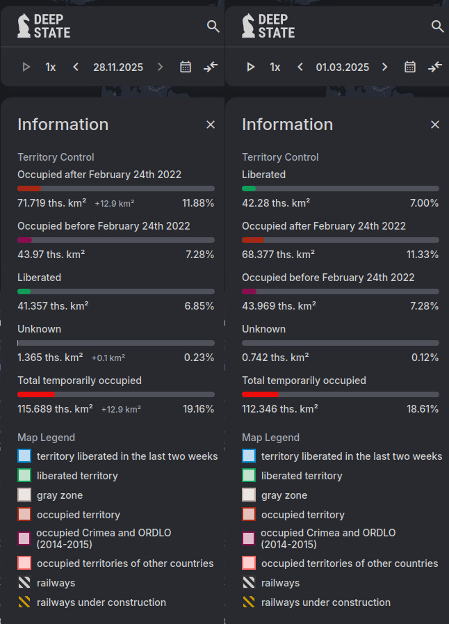 Previous: >>522440750Day 1,374 – Daily assessment: https://understandingwar.org/analysis/russia-ukraine/#research▶Latest>Russia test fired one of it's SARMAT ICBM from the Yasniy firing range in the Orenburg region. The test launch failed miserably breaking apart just mere minutes from launch following which it smashed into the ground.>Chairman of the Office of the President Yermak has submitted his resignation - Zelenskyy>Strikes at Saratov oil refinery and UAV storage site at Saky airfield, as well as other military facilities - AFU>Barracks of Akhmat-North Unit droned in Grozny>Chasiv Yar has gone from russian victory, back to ONGOING>Ukraine struck Cheboksary plant which makes EW and missile components>Leaked call of traitor Witkoff and ziggeria's Ushakov occurred via Whatsapp, plan originally written in January>Ukrainian troops gain ground in Pokvorsk, Kupyansk, Vovchansk>US brokers Ukraine talks in Abu Dhabi as Trump tries to push deal, spokesperson for US army secretary says discussions with officials from Kyiv and moscow are going well>Ukraine made significant changes to US ‘peace plan’, some of russia’s maximalist demands have been removed - The Guardian>Tremendous amount of progress in the Geneva talks with Ukraine, there are a couple of issues we need to work on, none of them are insurmountable, we just need more time than we had today. I honestly believe we'll get there. - Rubio>Shatura Plant in mosquew oblast got hit by drones▶Telegramhttps://rentry.org/telosint2023https://t.me/ukr_pics▶Intelhttps://t.me/DeepStateENhttps://odin.tradoc.army.mil/WEG (equipment explorer)https://ukr.warspotting.net (visually confirmed losses)▶Mapshttps://deepstatemap.live/enhttps://liveuamap.com/en▶DISPOSABLE SOLDIER (diary of a RU mobik)TOUR 1: files.catbox.moe/34fuhc.txtTOUR 2: files.catbox.moe/uj2wut.txtTOUR 3: files.catbox.moe/hmyd98.txtTOUR 4: files.catbox.moe/cdenxe.txt