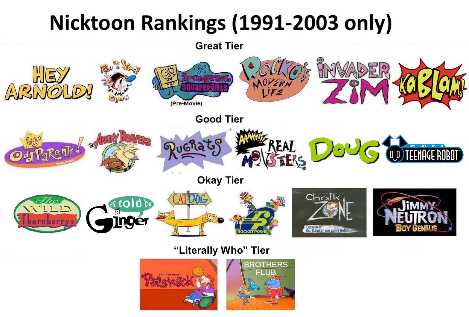 >>522476644Rather than rank, I'll just list what I actually watched from that list: Hey Arnold, SpongeBob, Invader Zim, Fairly Odd Parents, Rugrats, Teenage Robot, CatDog, Rocket Power, Chalk Zone, and Jimmy Neutron. As for the others, either I didn't watch them, watched them rarely but not regularly, or was watching Cartoon Network in their timeslot.
