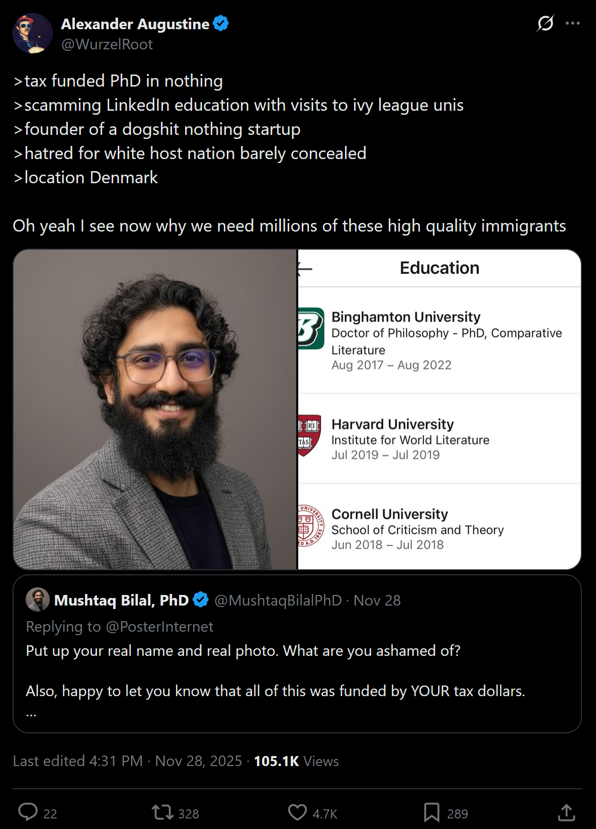 How does Elon Musk oscillate between "Leave my brown H1B slaves alone, you white Americans are just too dumb and lazy!" and "White people are under attack!" so easily? It's like he has someone run his account during the day and then gets control other times