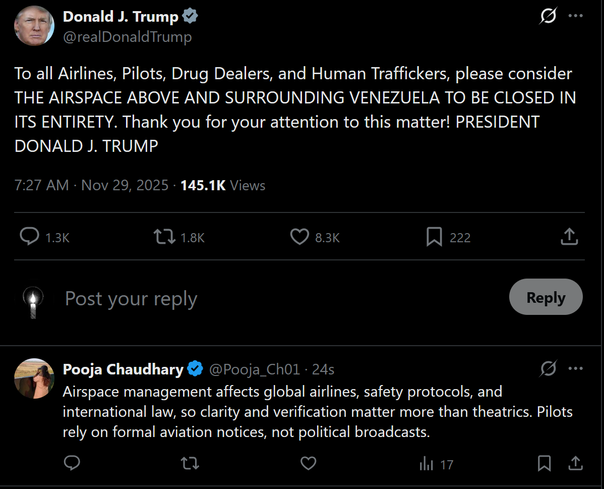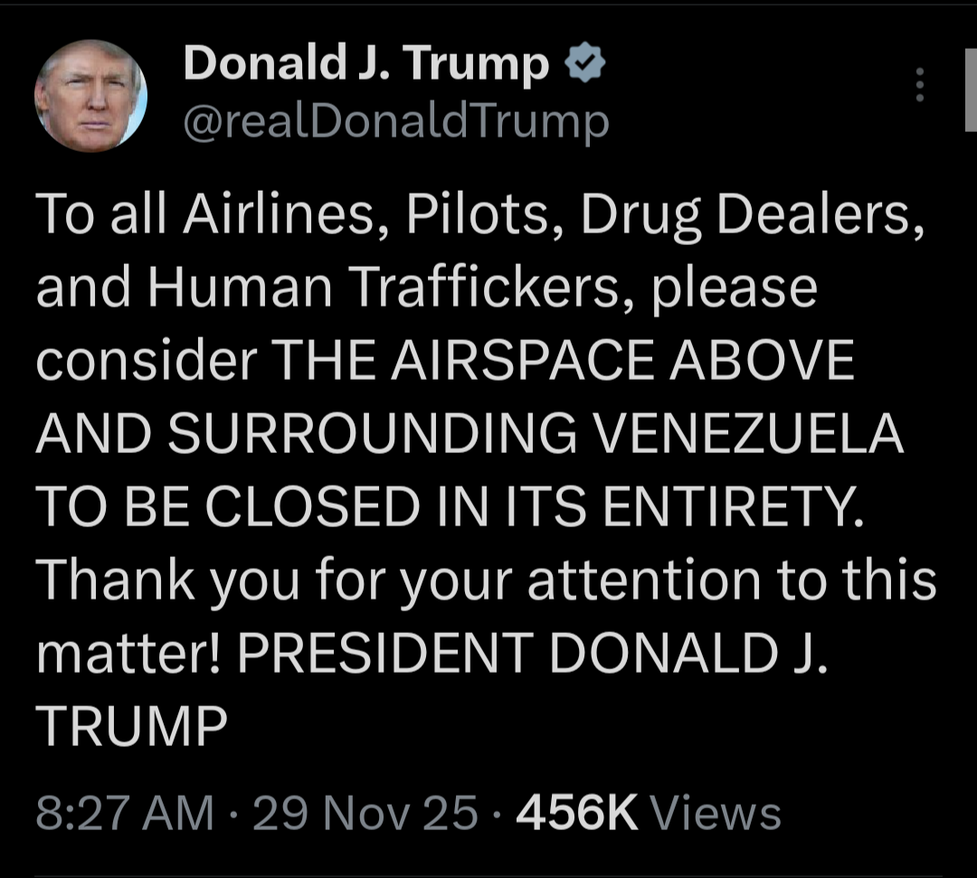 >>522491205So what are the implications? If the airspace above and surrounding Venezuela is considered "entirely closed" what does this mean?