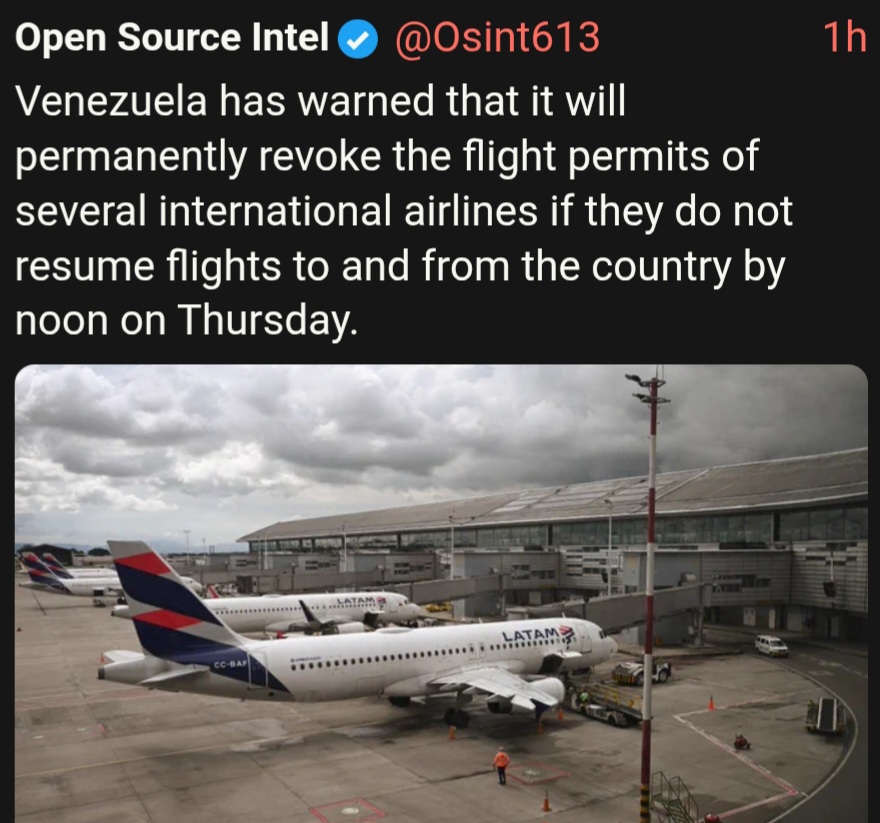 >>522491865Less air traffic in and out of Venezuela. No US air traffic for sure and might see a reduction from Colombia and other surrounding / LatAm countries.