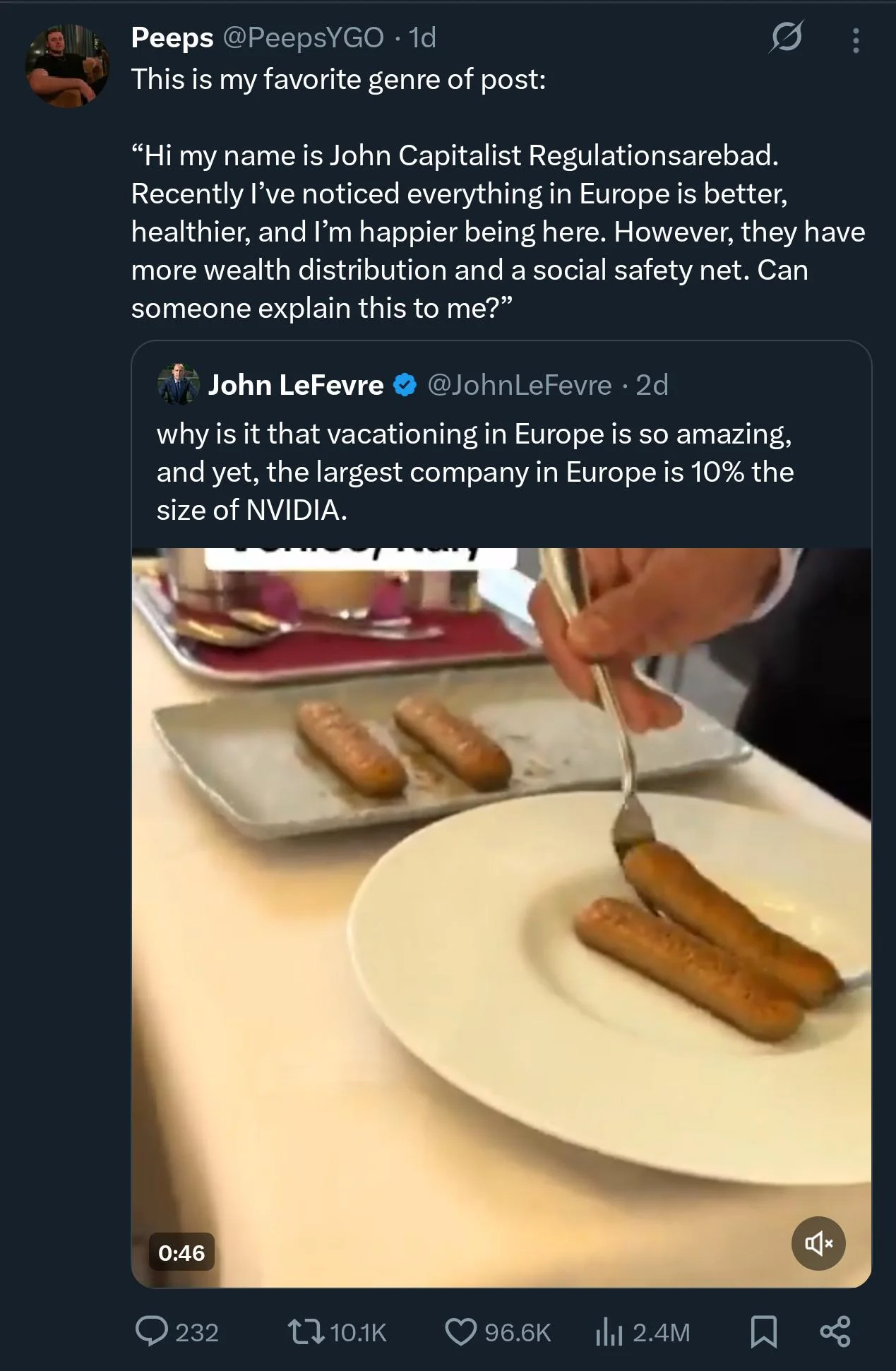 >>522510055Both are wrong.Vacationing experience doesn't mean shit. And the largest company in Europe being 10% the size of nvidia also doesn't.Some things are actually better in Europe due to labor laws and wealth redistribution. But those government interventions in the economy come at a cost, and I'd say, with most people in Europe having significantly less purchasing power than people in the US, it's probably not worth it.It's not worth it to have extra job security when it's fucking hard to find a job as a result and you also make less.It's not worth it to have free healthcare if it's paid with taxes and has years long waitlists.It's not worth it to redistribute wealth to way too many people who don't work if it means you're still poor if you work.It's not worth it to have the government give you a pension if it means the government pension system is going to be a pyramid scheme.It's not worth it to have some bureaucrats regulate every little thing because they feel entitled to dictating our lives, if it means we'll have an annoying cookies sign on every website due to their whims.It's not worth it to have the government set a maximum price to rents, if they're creating a shortage this way, and they're also the ones making housing expensive in the first place with zoning laws.