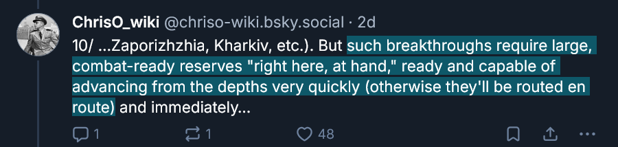 >>522526400That would make sense if Ukraine had any meaningful reserve forces to exploit when the Russians stop advancing, but russia isn't stopping and Ukraine has very limited reserves, most of the experienced ones which were wasted in kursk