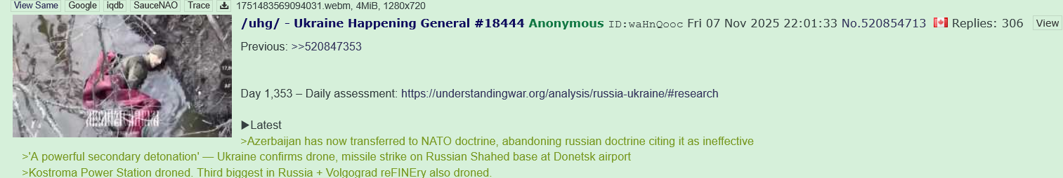 Previous: >>522511250Day 1,375 – Daily assessment: https://understandingwar.org/analysis/russia-ukraine/#research▶Latest>The russian, "bunny ears" offensive has now concluded, resulting in a total russian defeat>Ukrainian forces struck overnight Afipsky refinery, Beriev aircraft plant in Taganrog where Tu-95 bombers are modernized sparking fire in the repair shop, and destroyed a 5000-cubic-meter tank at Tuapse oil terminal, General Staff reported>Drones of the Security Service of Ukraine hit two sanctioned russian tankers in the Black Sea>Russia test fired one of it's SARMAT ICBM from the Yasniy firing range in the Orenburg region. The test launch failed miserably breaking apart just mere minutes from launch following which it smashed into the ground.>Chairman of the Office of the President Yermak has submitted his resignation - Zelenskyy>Strikes at Saratov oil refinery and UAV storage site at Saky airfield, as well as other military facilities - AFU>Barracks of Akhmat-North Unit droned in Grozny>Chasiv Yar has gone from russian victory, back to ONGOING>Ukraine struck Cheboksary plant which makes EW and missile components>Leaked call of traitor Witkoff and ziggeria's Ushakov occurred via Whatsapp, plan originally written in January>Ukrainian troops gain ground in Pokvorsk, Kupyansk, Vovchansk>US brokers Ukraine talks in Abu Dhabi as Trump tries to push deal, spokesperson for US army secretary says discussions with officials from Kyiv and moscow are going well▶Telegramhttps://rentry.org/telosint2023https://t.me/ukr_pics▶Intelhttps://t.me/DeepStateENhttps://odin.tradoc.army.mil/WEG (equipment explorer)https://ukr.warspotting.net (visually confirmed losses)▶Mapshttps://deepstatemap.live/enhttps://liveuamap.com/en▶DISPOSABLE SOLDIER (diary of a RU mobik)TOUR 1: files.catbox.moe/34fuhc.txtTOUR 2: files.catbox.moe/uj2wut.txtTOUR 3: files.catbox.moe/hmyd98.txtTOUR 4: files.catbox.moe/cdenxe.txt