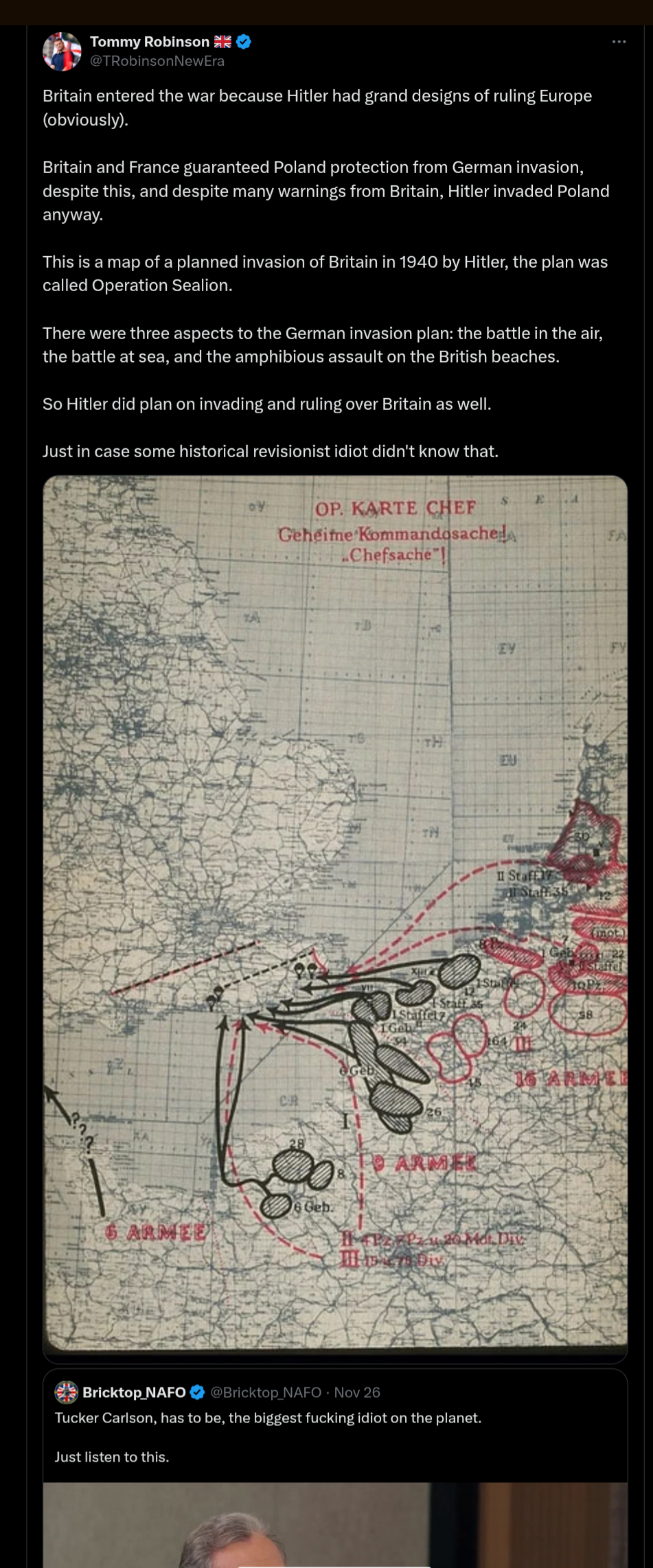 >>522525133>Using toss away invasion plans that were created by some Wehrmach Generals who then showed the plans to Hitler only for Hitler to dismiss the plans as evidence of Hitler's plan to invade BritainPeak Tommy "I suck jewish cock all day" Robinson right there