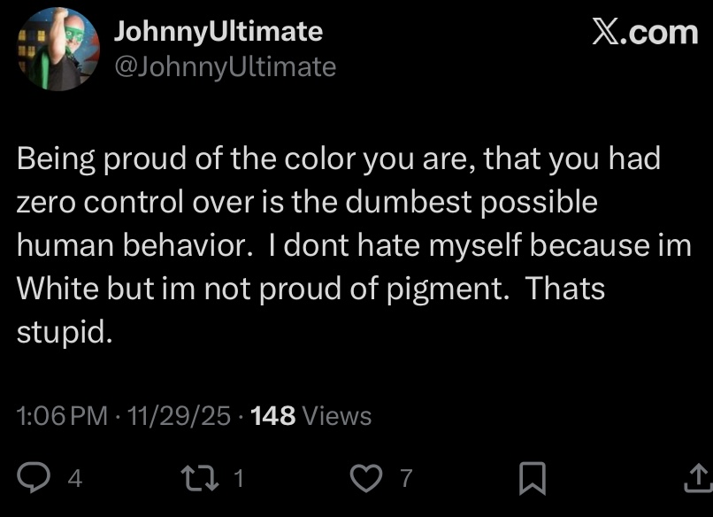 >>522541635That's not the argument. They're saying it's dumb to be proud of being a certain color.>>522542853No. I'm black and I have actual accomplishments to be proud of.