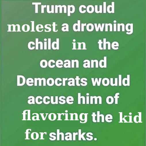 >>522551534 That's based off an LBJ quote. Nice hypotheticals, but the only thing Trump has done with children is on a certain island. Restated to make more sense "Trump could rape a child on an island, and America would accuse him of protecting Mossad blackmail by hiding the files".