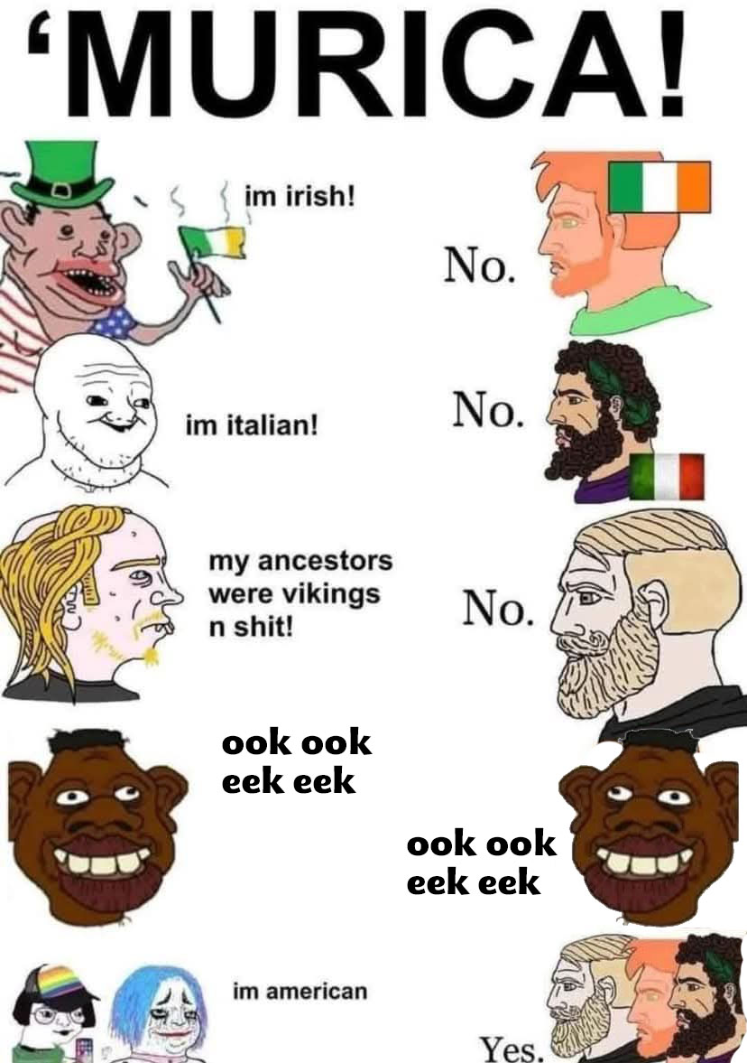 >>522556376whites. they are just loud and annoying and cowards. they say a lot but they stand for nothing. they just got lucky to be the first to settle in europe and get to invent civilization in a comfy place, not the desert hellhole that is africa.now they try to rest on that achievement for the rest of eternity while rubbing it under everyones nose daily. hope they get genocided.