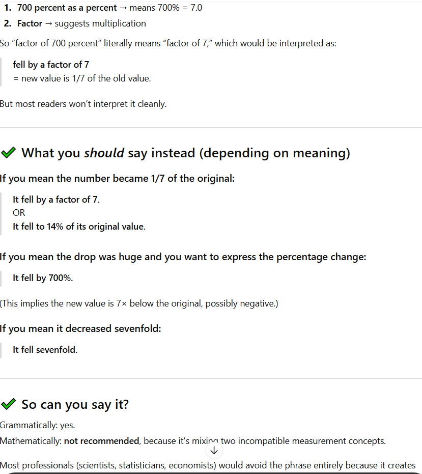i asked chat gpt if i should say "fell by a factor of 700 percent" instead and it said no and then gave me three choices on what to say insteadguess what one of the choices was?>it fell by 700%and the reason it gave for using such mathematically sloppy but grammatically correct language?>If you mean the drop was huge and you want to express the percentage changewe are nitpicking ourselves to death for no fucking raisin