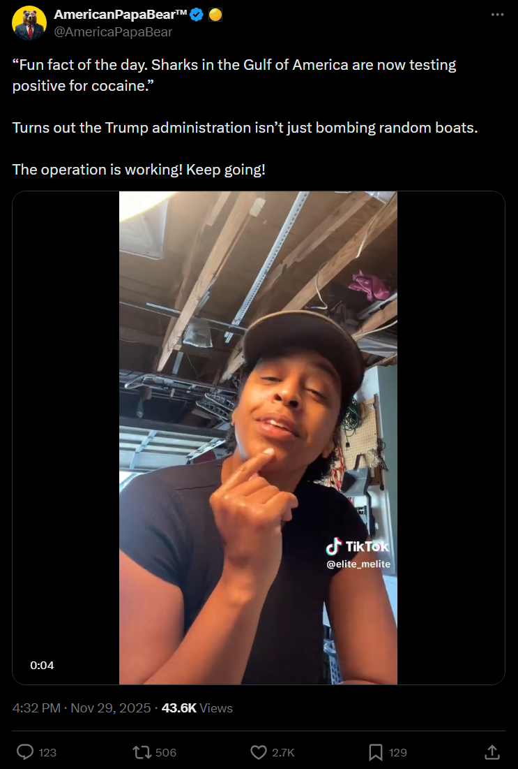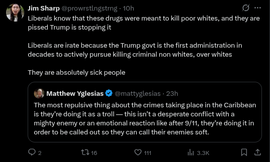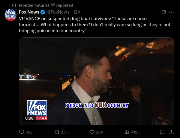 >>522572107Really says a lot that both neocon xitter & desantoid xitter (I think) are taking big issue with bombing narco terrorists. >captcha POOPD