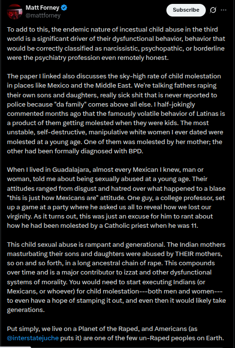 >>522574388"Americans being the few unraped people alive make sense as to why they want to rape us so badly: They want us to go through what they did, but because theyre brown they dont have an IQ high enough to grasp of concept of "Breaking the cycle" and "Being the better man". "