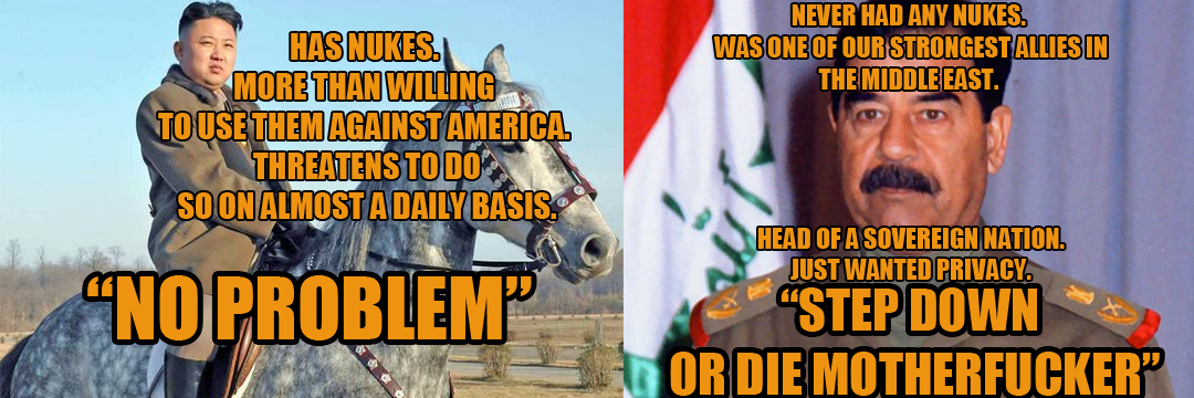 saddam literally invaded Iran and then Kuwait, used chemical weapons on his people, killed anyone he didn't like, and most importantly, had no benefactor. North Korea was protected by China and Russia. That's why they got away with saying so much shit even before they had nukes
