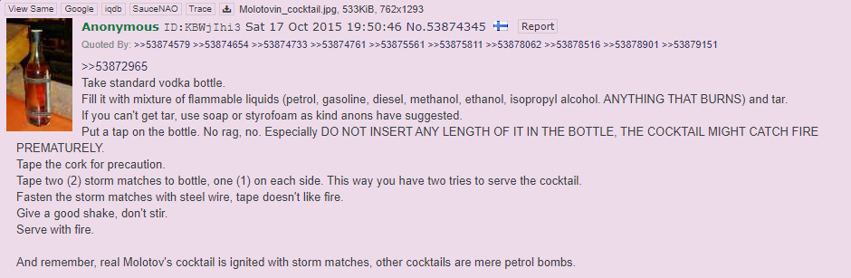 >>522570988Direct action, though carried out by a minority, can provoke an overreaction from the establishment that fears it excessively, potentially triggering a chain reaction that spreads to the masses for better or worse. Therefore, when no other viable options exist, it is better than doing nothing.Look at the far left, while it's true their views align somewhat with the establishment, they've also taken to the streets to force their ideas on bureaucrats through blatantly direct threats.Well, even then, if it's hopeless, the only option left is lone wolf terrorism.BONUS: Arson is highly prolific and molotov cocktail is essentially an untraceable weapon.https://en.wikipedia.org/wiki/Happy_Land_firehttps://en.wikipedia.org/wiki/1998_Gothenburg_discotheque_fire