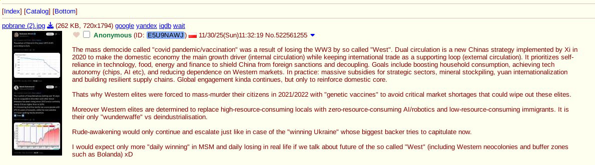 >>522573444Cool image. I'm not sure I agree with it though. Maybe parts of it.Fauci was funding the wuhan bioweapon lab where the initial leak happened. What if this was an attack by the US on China? Or they could be working together to reduce their populations. I also wouldn't call what happened WW3 because all we've had is regional conflicts, a true WW3 would involve total war as it did the previous two times. Not limited war for profit where the banks fund both sides. If that is China's policy, then it's brilliant, and I can only hope the USA will get some sense and become independent too. I've always been opposed to globalism. The USA could have been completely self-sufficient but we just had to fall for the trap of globalism and empire building. And mass immigration is just pure suicide. I mostly think it's funded by foreign terrorist orgs like the Soros Foundation, as a weapon to destroy the USA. Trump is working hard to cut off the migrant flow and send them back so he seems to agree with me.