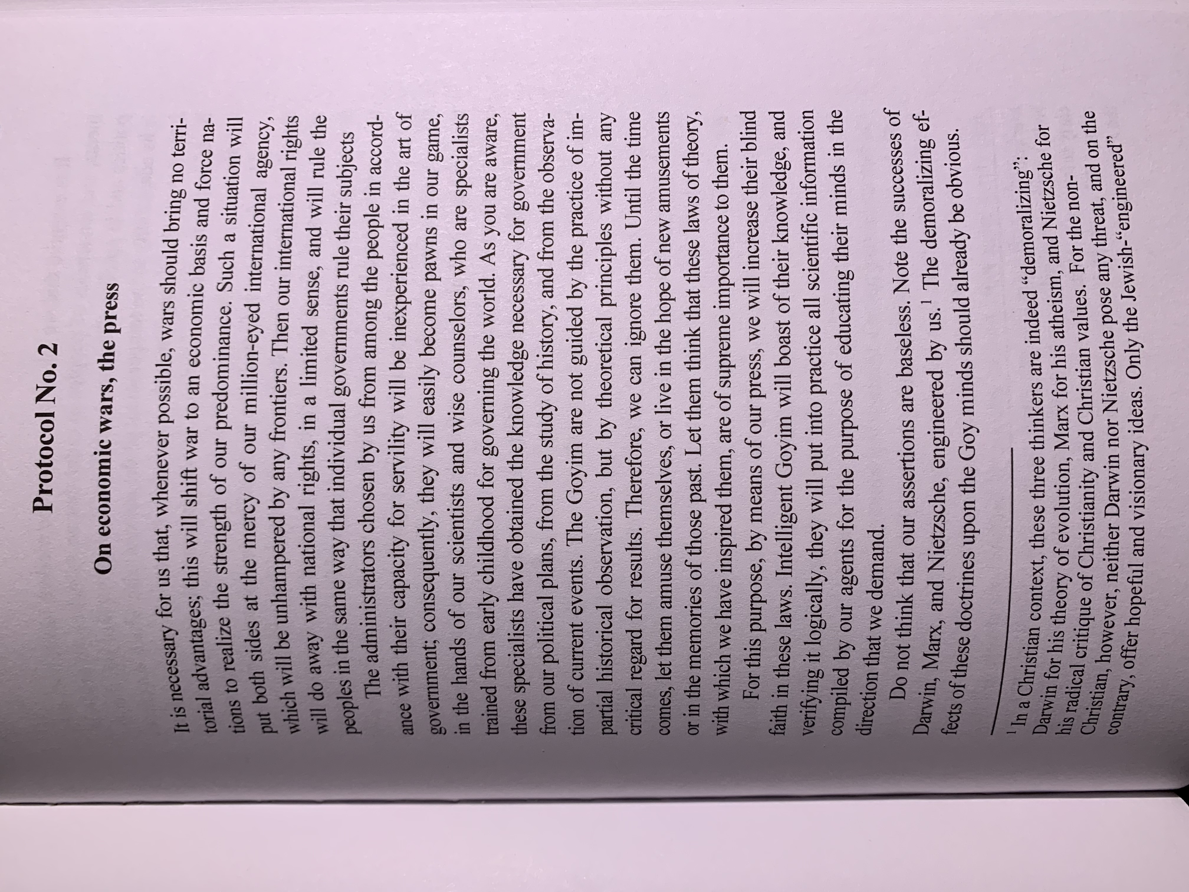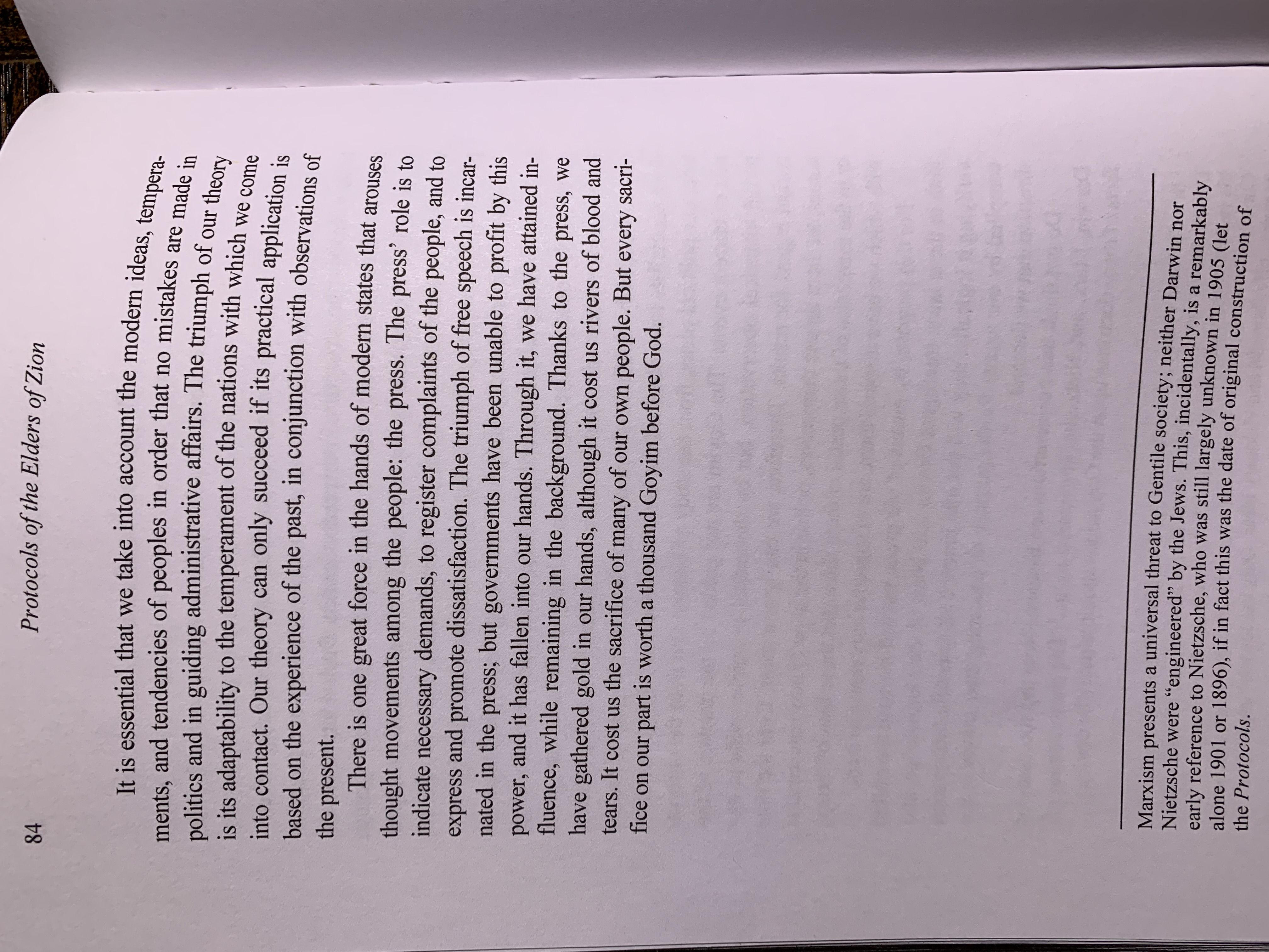 >>522585118Thanks, it's towards the end of Protocol 9.Brasol gets it the worst, but Marsden still translated it as literally tunnels, which would then be used to demolish physical buildings. The actual saying it's based on is a "Ukrainianism" pointing to the text originating there.Also, off the top of your head, do you know how he handles the "Nietzsche, Darwin, and Marx" thing? It's pointed to in so many "debunkings" despite it not being present in the original text, and cones from an editor's note, absorbed by Nilus.