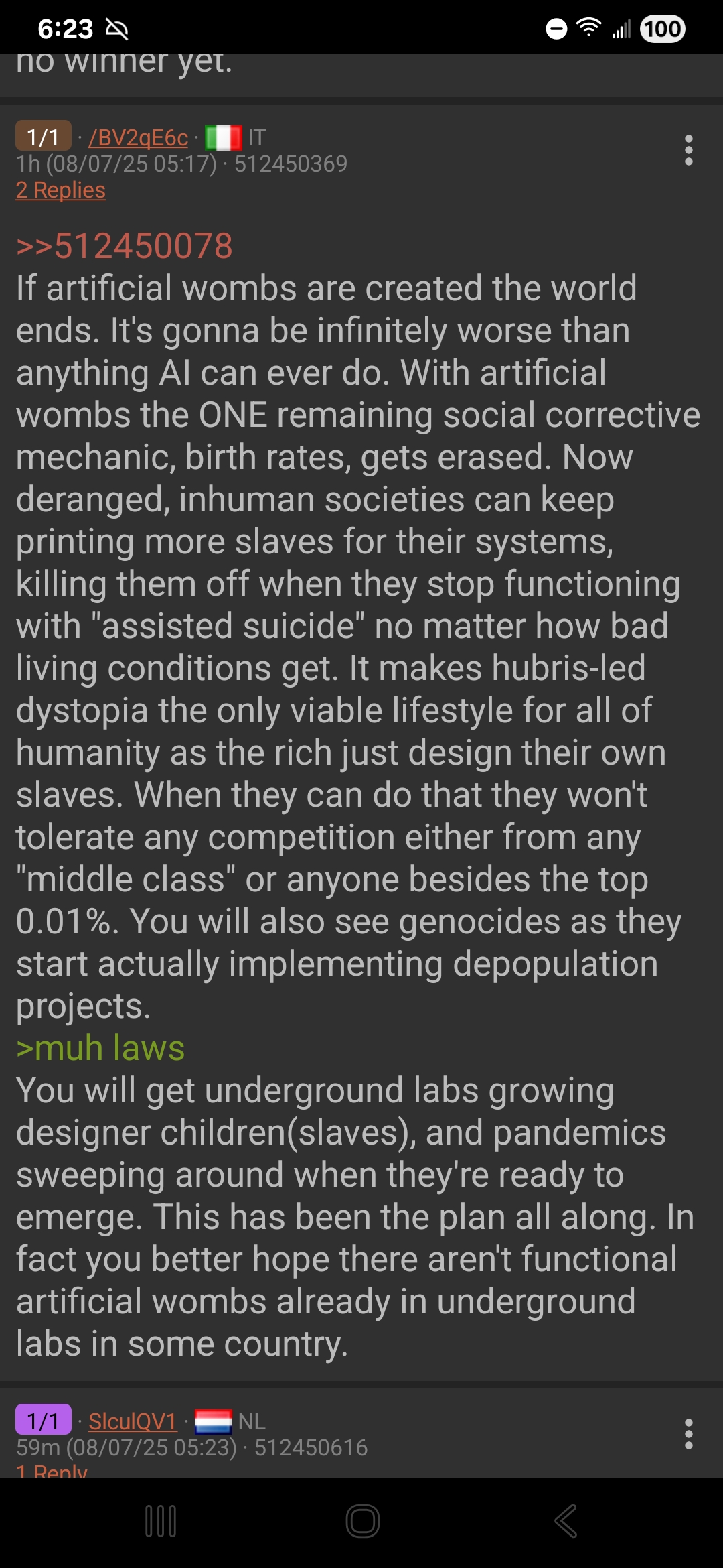 >>522599459>If you get bio wombs the elites will legalize murder and kill everyoneWith AI making sure it's possible to just replace workers, trust me this will happen no matter what, they'll use robots instead.