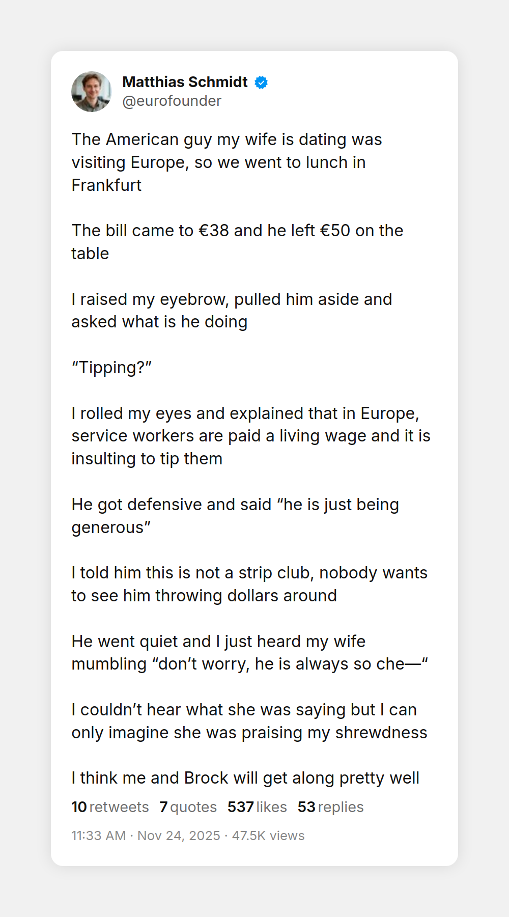>>522604566I don't know what you mean man I found it on Twitter and thought it was stupid for a 40% tip so I wanted to share it here with you guys