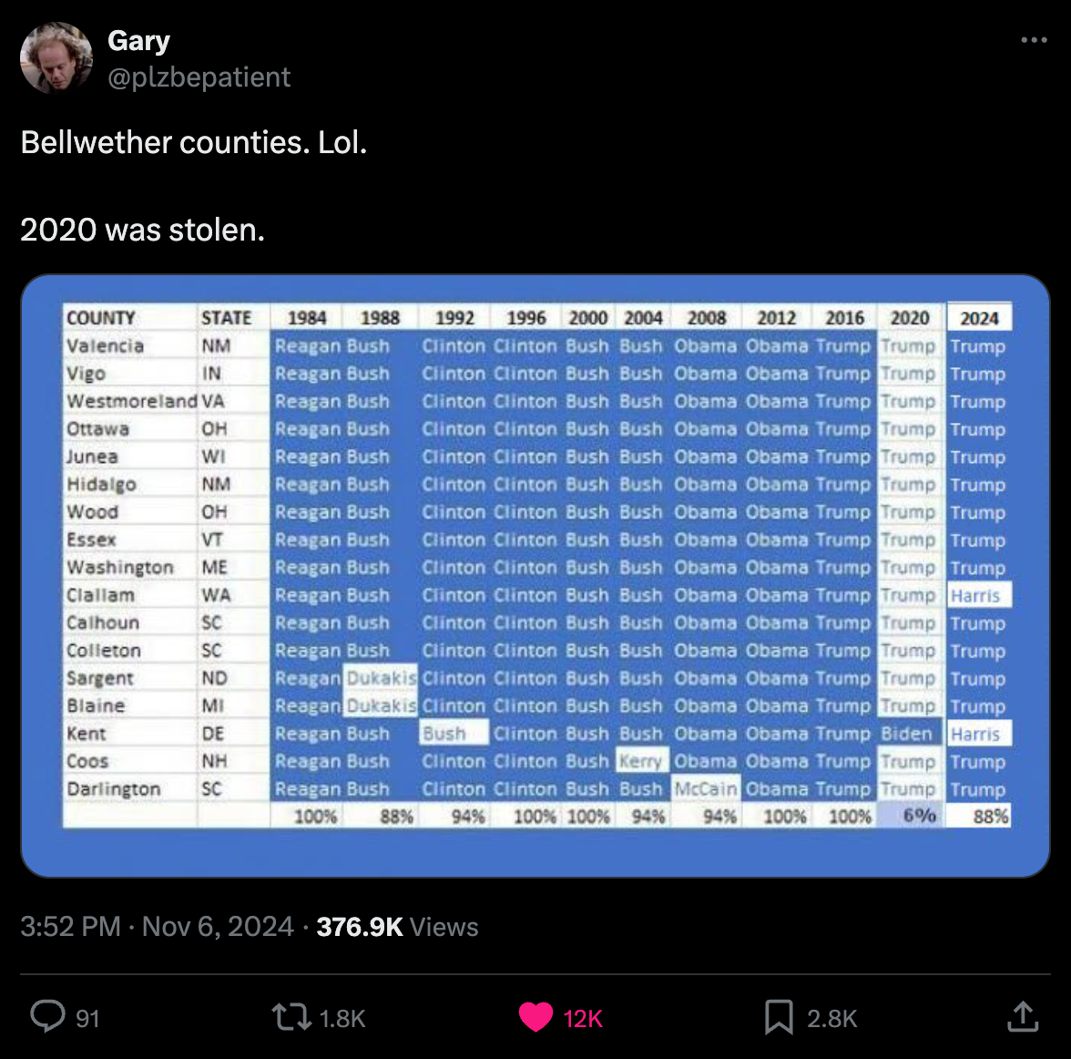 >>522608382>>BELLWETHERS DON'T MEAN NOTHINThey don't literally not even 40 years of data and they failed to predict bush win in 2000. Please tell me why is it so hard to find real physical evidence? Why can't Trump put a single person in jail? Do you have an actual excuse for that?