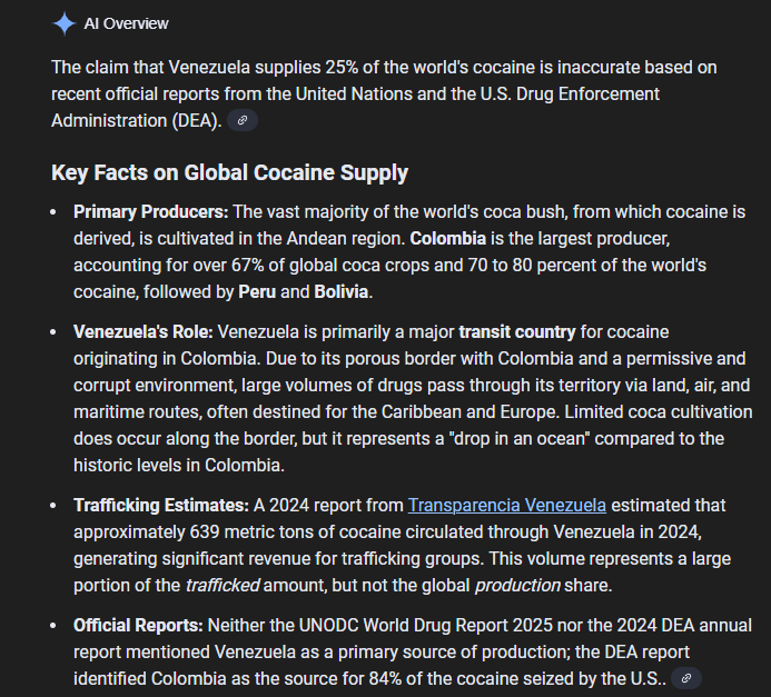 >>522604045Trump's DEA said that 90% of the Cocaine that gets consumed in America comes from Colombia, and from that 90% only 8% of the total consumed Cocaine in America went through America. Venezuela doesnt produce or have labs, its colombia, Venezuela is basically Drug UPS. It goes to other countries and they ship it to Europe most of times