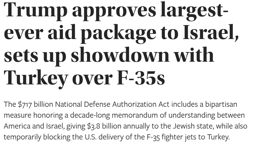>>522611203You could have seen from the retard's link it was from 2018, but regardlesshttps://www.jns.org/ndaa-signed-by-trump-confirms-aid-to-israel-delays-sale-of-jets-to-turkey/
