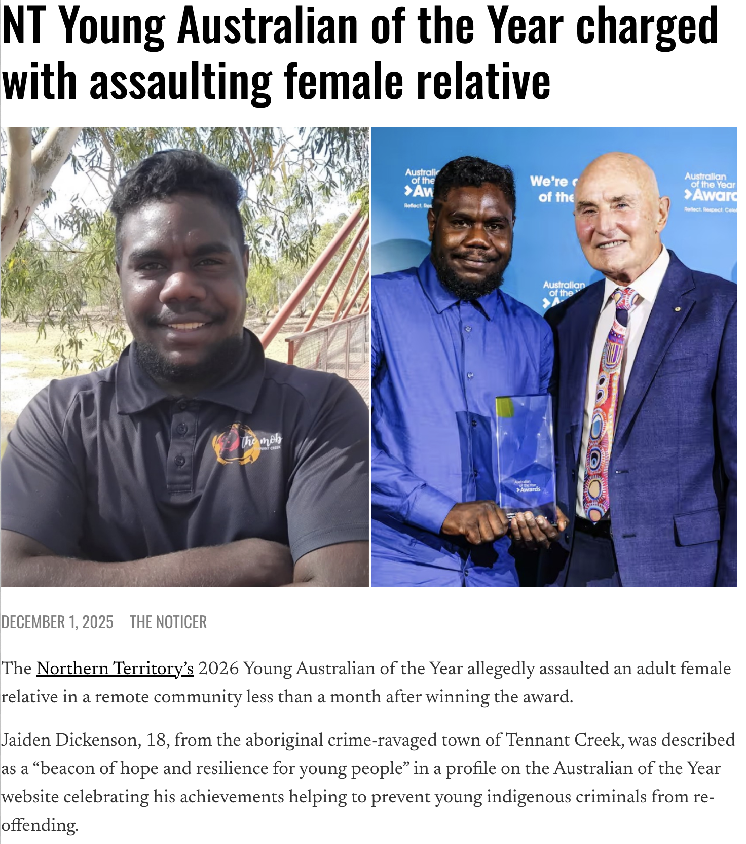His Australian of the Year profile praised him for his work as a Mob Youth Diversion officer, saying he “helps young people address the trauma at the root of crime and social disorder by taking responsibility for their behaviour, overcoming their personal challenges and moving towards rehabilitation”.“Jaiden’s approach is grounded in empathy, cultural understanding and the belief that every young person needs someone to believe in them. His work has led to a significant reduction in the number of youth re-offending and supported engagement in more positive pathways,” the profile stated.“In mentoring young people, Jaiden’s influence has created a ripple effect, empowering other young people to also take up roles as mentors within the Tennant Creek Mob.”Last month he told NITV that kids in the troubled town saw him as a role model.“Most of the kids in the community are looking up to me and they keep saying I want to be like that, I want to be like Jaiden,” he said.