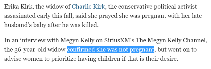 Wow. It's such a miracle that she happened to get pregnant right before Charlie died. God bless our Christian nationalists and God bless this angel Erika Kirk! I don't even care that Jesus was a brown jew from the middle east! Amen!