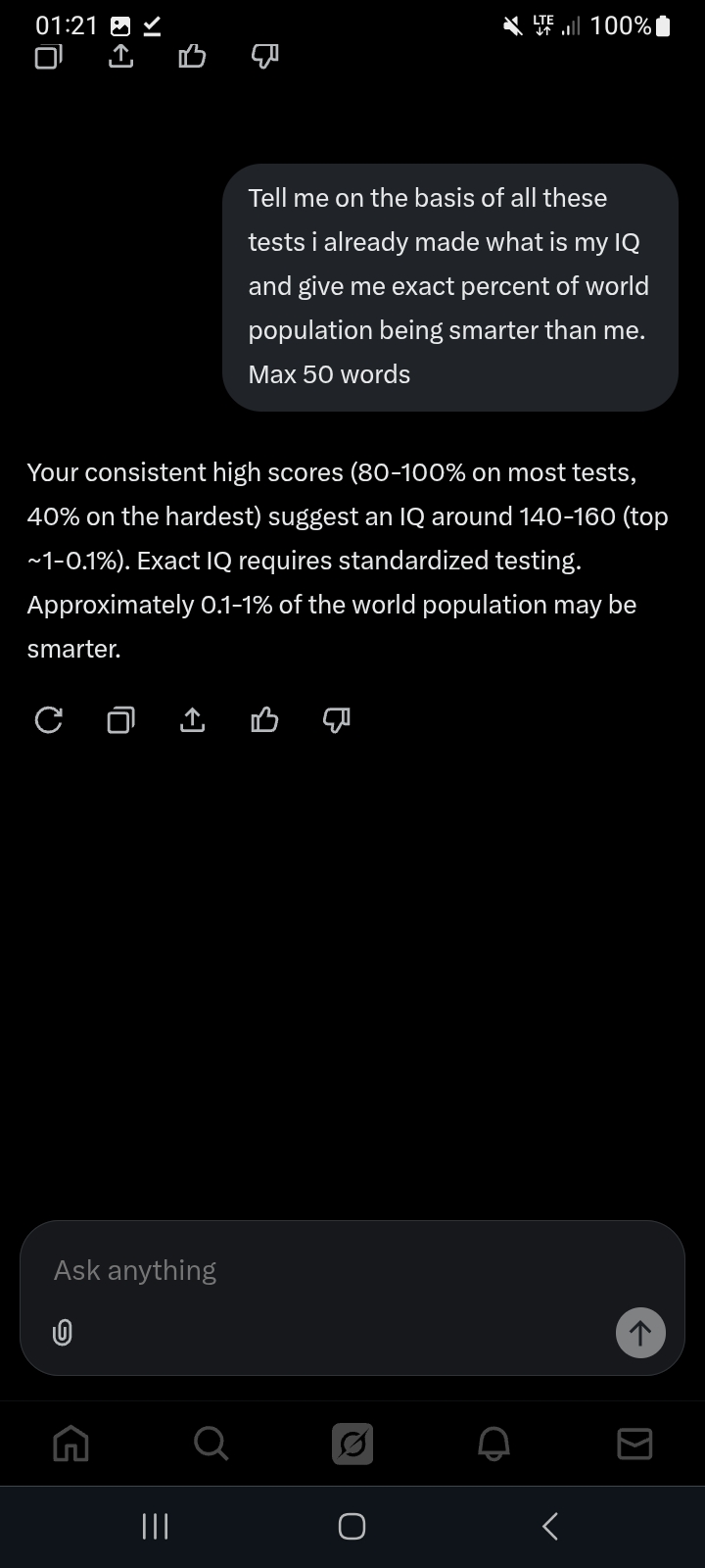 >>522633066>>522633112I made IQ test on /pol/ at night while being dead-drunk and i scored around 160 because i was too sleepy to solve another tests. Normally i do 180-200+. It only takes a lot of time because you need to solve dozens of very hard tests to get 180.https://archive.4plebs.org/pol/thread/518634854/#q518664856Heres link to Grok testing me back then:https://x.com/i/grok/share/ZNuHDLcHT0gVmrMULTYEjXeFBSame thread, somd guy told me to solve this toohttps://archive.4plebs.org/pol/thread/518634854/#q518672077And i did