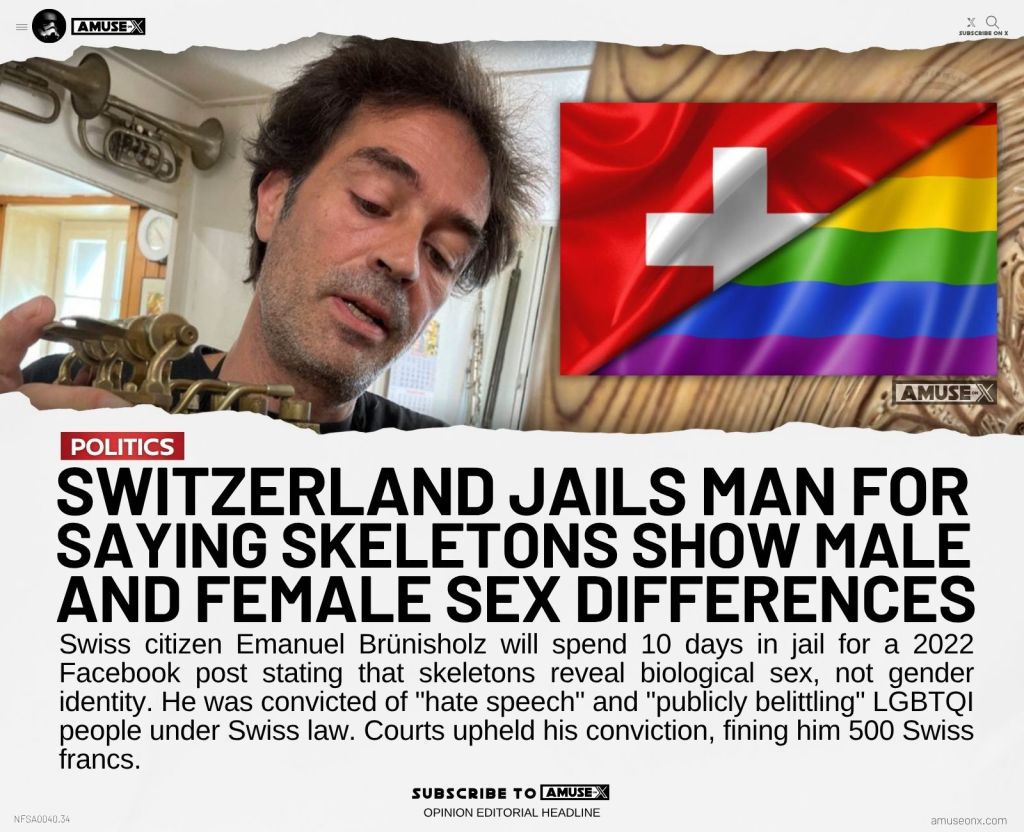 >>522643140A more honest headline:Switzerland fines a man for the comment about trannies, he refuses to pay the fine, he goes to jail. It's both truthful AND outrageous. Why post clickbait?