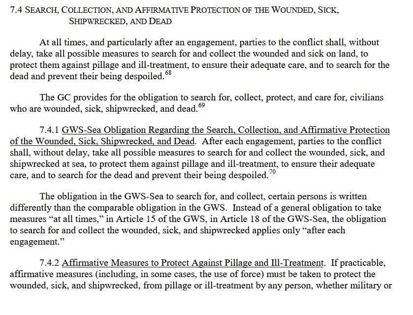 section 7.4 of the department of defense law of war manualhttps://ogc.osd.mil/Portals/99/department_of_defense_law_of_war_manual.pdf>At all times, and particularly after an engagement, parties to the conflict shall, withoutdelay, take all possible measures to search for and collect the wounded and sick on land, toprotect them against pillage and ill-treatment, to ensure their adequate care, and to search for thedead and prevent their being despoiled.