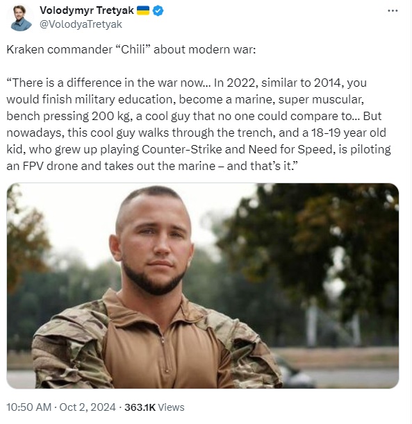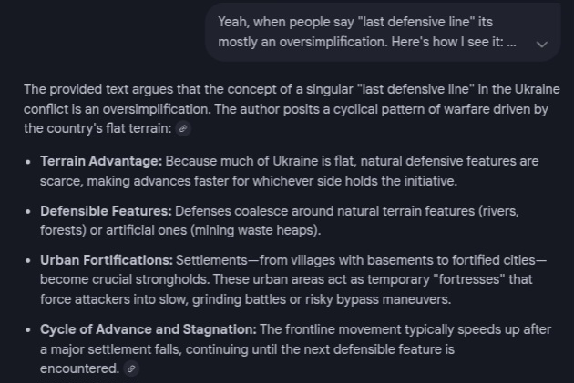 >>522676497>We heard after Avdeevka there was nothing to stop the Russians from going to DniproYeah, when people say "last defensive line" its mostly an oversimplification. Here's how I see it: Ukraine is largely flat, which makes it harder for a defensive force to set up good defensive lines. That makes it so that the side that has the initiative can advance somewhat quickly up to the next terrain feature that can be more easily defended, which is usually a river or a forest, with the odd waste heap around mining towns. That increases even more the importance of settlements, serve as more defensible places than the Ukrainian countryside. Even villages are somewhat useful since many houses have basements where soldiers can take cover. Towns and cities, if properly manned and fortified can become like fortresses, forcing the opposing force to try to go around it or slowly take it over, blowing up most buildings and slowing down progress. After they are taken, the frontline movement speeds up for a while until the next defensible terrain feature comes up, whether natural or artificial, with gradually general advances speeding up as the Ukrainian army gets attritied more and more. This last part about cities being turned into fortresses isn't unique to Ukraine, and can be seen as a continuation of the trend observed since WWII of large cities presenting a challenge to invading forces.If you want to be semantic, you can say that that Ugledar was the "last defensive line" of southern Donetsk, Pokrovsk is the "last defensive line" of central Donetsk (since it would allow for Konstantinovka to be bypassed, not that it will be needed since the Russians are already fighting on its outskirts), Huliaipole is the "last defensive line" of southeastern Zaporizhzhia, etc. Because frontline changes speed up after settlements fall in that sector, at least until the next defensive position is reached.