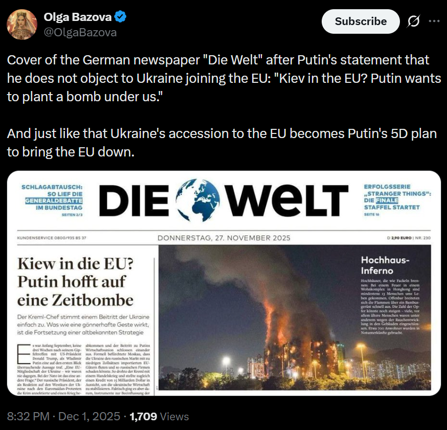 >And just like that Ukraine's accession to the EU becomes Putin's 5D plan to bring the EU down.
