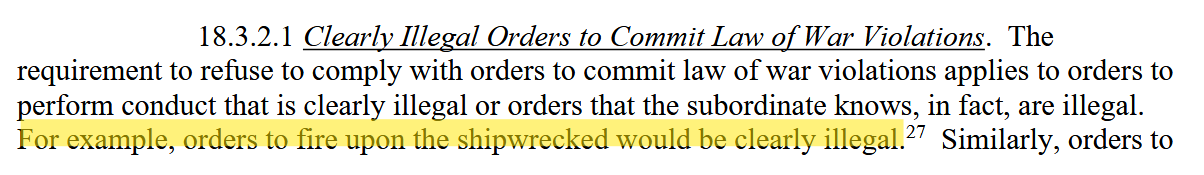 >>522686188>A civilian combatant is not covered under the Geneva Conventions and can be tortured and executed upon surrender.This isn't correct. Geneva Convention Protocol II was drafted to extend its protections to Civilians. Are you under the impression that it's legal for signatories of GC to murder civilians with impunity? You're fucking retarded. And the other poster is correct that GC is also incorporated into US laws.Not only are American naval commanders prohibited from murdering the shipwrecked, they're also required to search them out to render aid as soon as practicable and to render that aid without respect for nationality or status. It's also the norm internationally for any captain of any ship to be required to render aid to any shipwreck. This is heavily abused by migrants to Europe who intentionally sink their craft near European vessels in the Med.You can cope and piss and cry, but every military expert who was actually there disagrees with you and asserts that this was a warcrime. That's why the brits stopped intelligence sharing. They cited culpability in warcrimes if they continued. That's why the American officers involved reached out to WaPo, the only reason we know about this. It's also the reason that Karoline Levitt didn't wear her cross today. Levitt doesn't cross up when she knows she has to lie. It's also the reason the WH distanced itself from the order. Because they know it's a war crime.