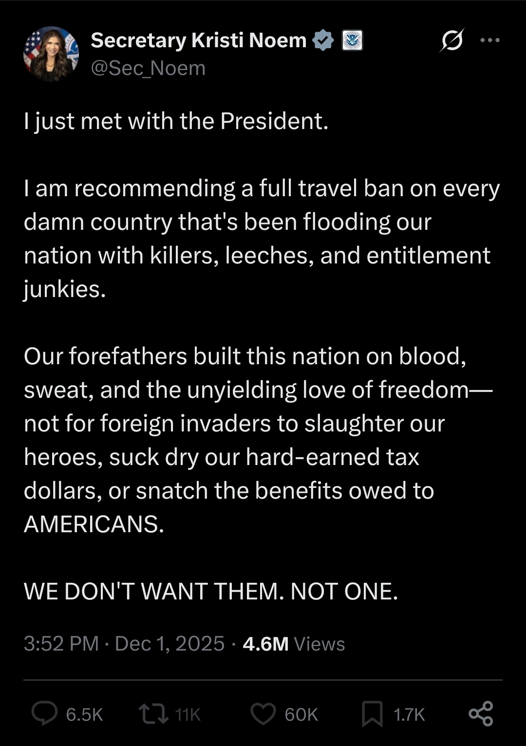 >>522690645Travel ban.https://x.com/Sec_Noem/status/1995642101779124476