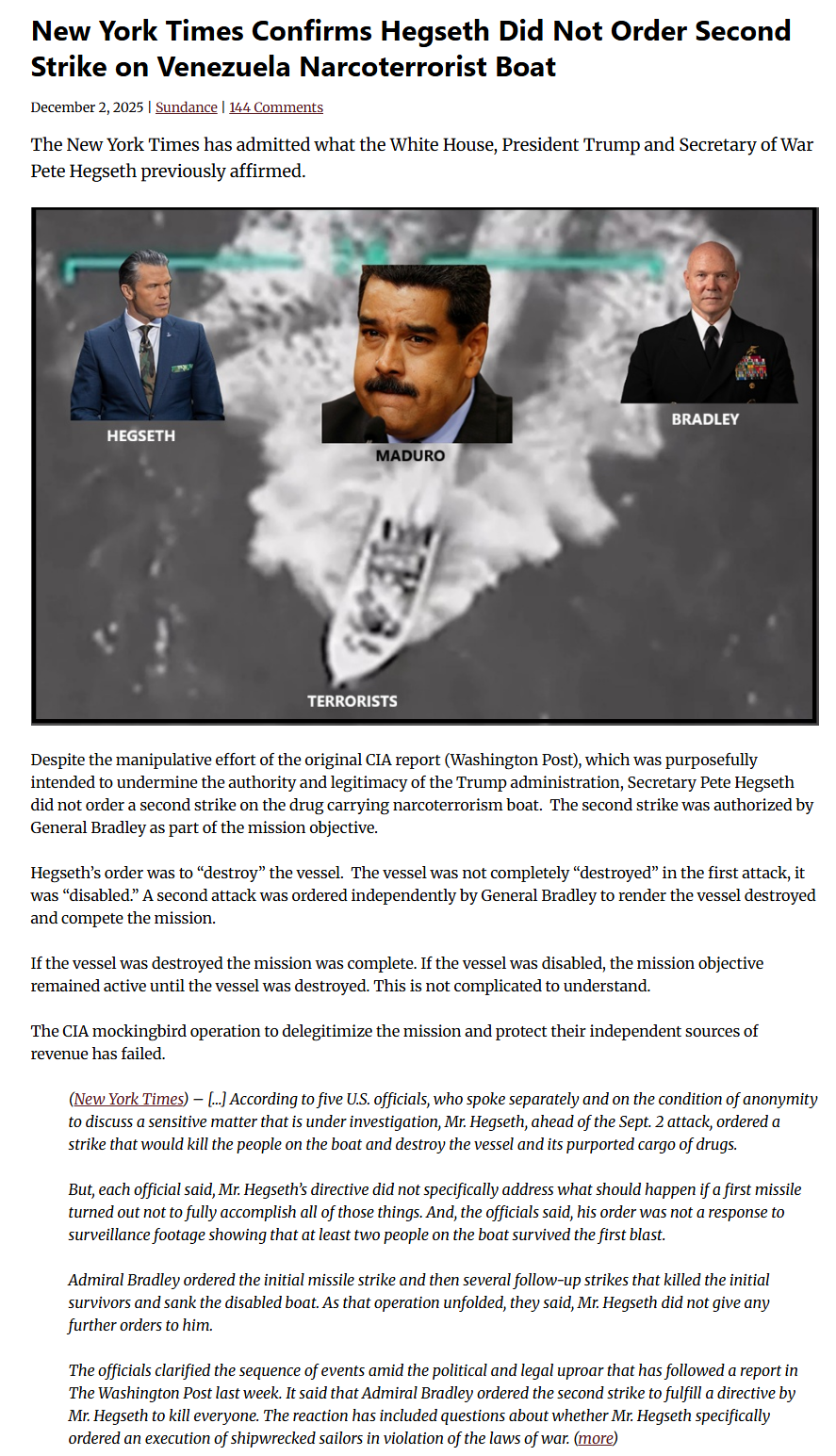 The discussion over the double tap is so retarded. "If they double tapped just to kill the survivors, then that's a heckin war crime and not okay. But if they double tapped to finish the job and destroy the boat and consequently the other 2 people on the boat died, then that would be okay and legal. Its not that the double tap is wrong with per se, its just why they did it" Absurd. The military is supposed to kill people. The crying about it is so cucked.