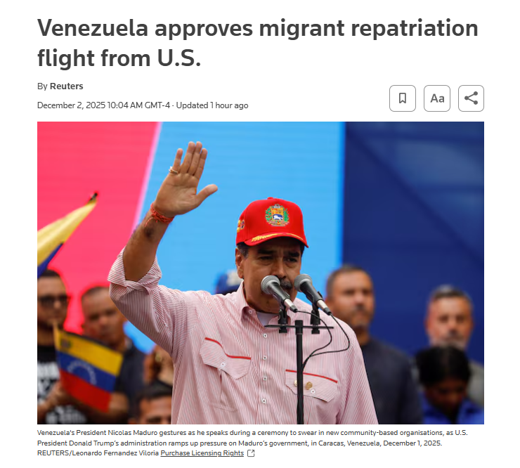 Dec 2 (Reuters) - Venezuelan President Nicolas Maduro has approved a migrant repatriation flight from the United States, Venezuelan authorities said on Tuesday, days after Caracas said comments by U.S. President Donald Trump had effectively halted the program."The Aeronautic Authority of Venezuela has received a request from the government of the United States to restart migrant repatriation flights from that country to Venezuela," the transportation ministry said in a statement on Tuesday morning.https://www.reuters.com/world/americas/venezuela-approves-migrant-repatriation-flight-us-2025-12-02/