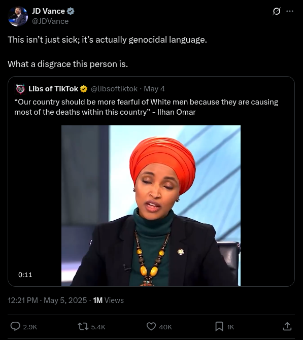 >>522710315Nobody with a brain would say her comments are genocidal. Where does she say that she wants harm done to white people? JD Vance is probably the dumbest person in the administration.