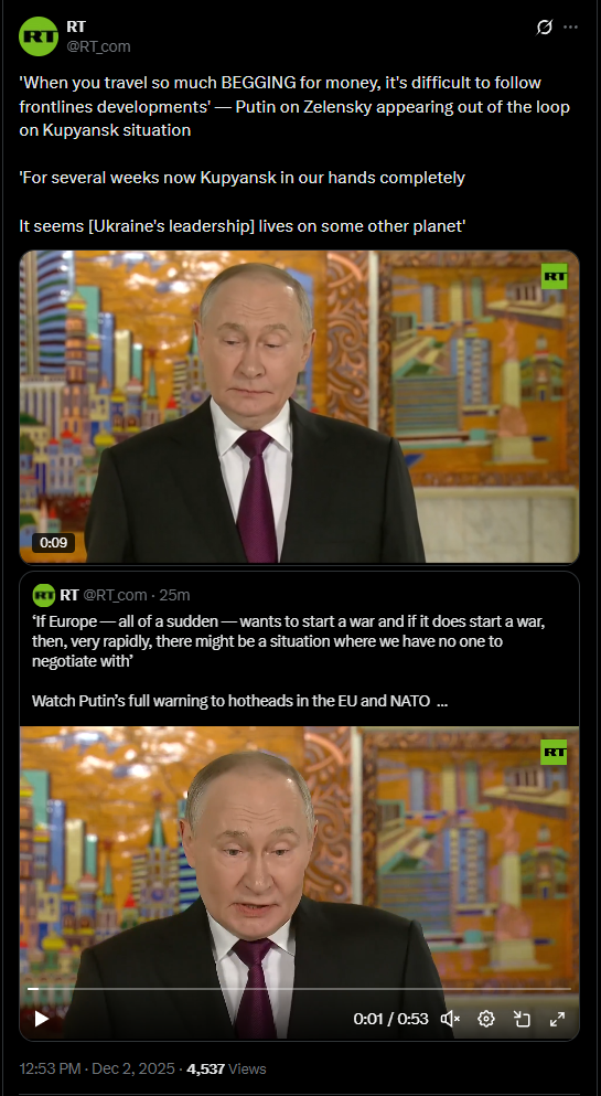 >MOSCOW, December 2. /TASS/. The Kiev authorities behave as if they live on another planet, as they are ignorant to the current economic situation in their country and the situation on the battlefront, Russian President Vladimir Putin said on Tuesday.>"It seems to me that the Ukrainian leadership is now dealing with other matters, and not with the situation in the combat zone. On the whole, it looks like they are living somewhere on another planet. And given that [Vladimir Zelensky] is on the road with his hand out, he probably doesn’t have time to see the state of affairs in the economy, and even more so at the battlefront," Putin said at a press conference commenting on Ukrainian media reports that the Ukrainian forces have allegedly been in Kupyansk for several days.>The Russian president reminded journalists at the press conference that Kupyansk has been under the control of the Russian military for several weeks already.>Since the start of autumn, the Russian military has liberated a total of 87 settlements in the special military operation zone, including Kupyansk, which served as a major hub for the Ukrainian military’s provision on the eastern bank of the Oskol River.>Ukraine’s Vladimir Zelensky recently announced during a press conference with French President Emmanuel Macron that Ukrainian forces were allegedly in control of Kupyansk.