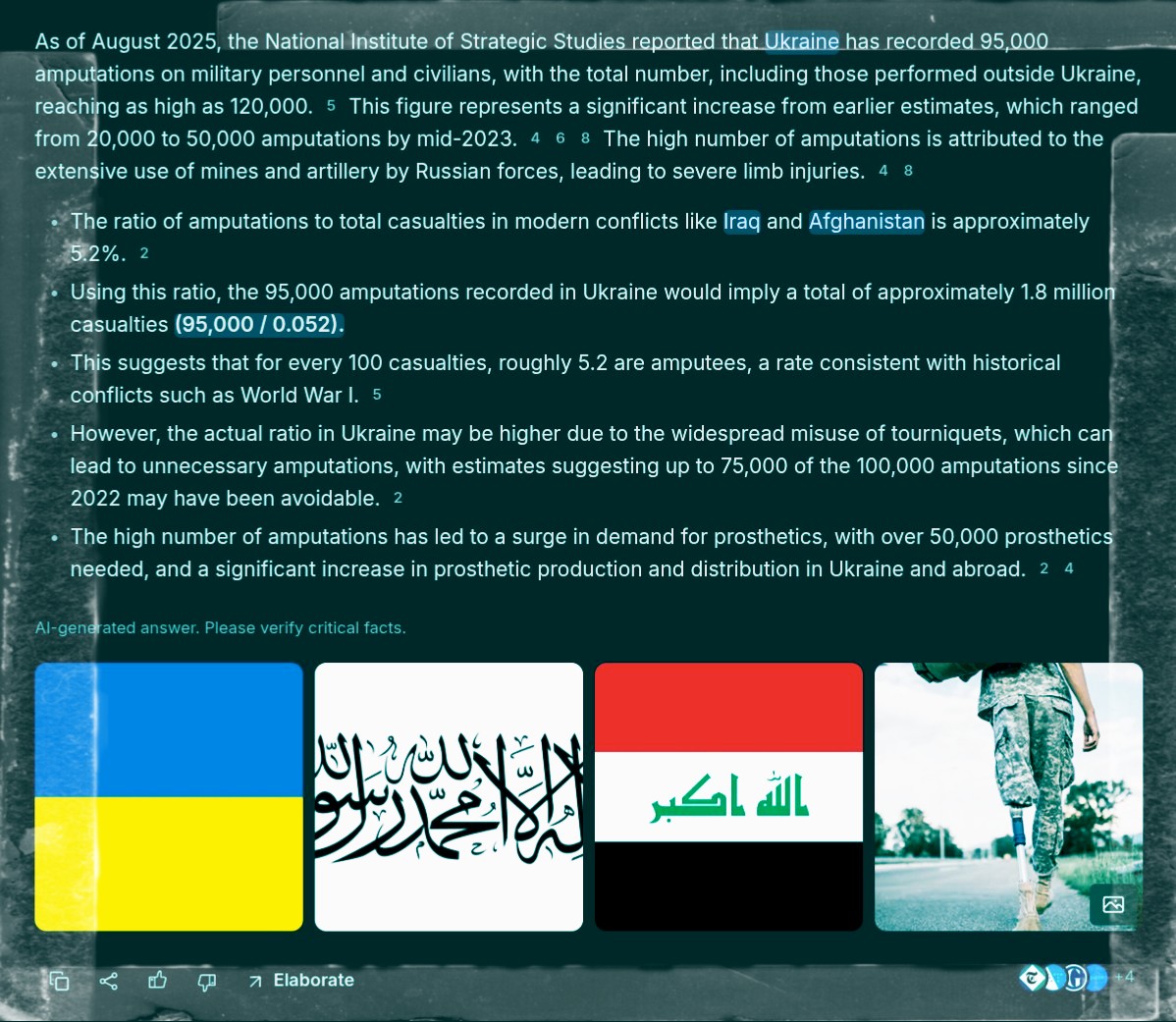 >>522718103here you go:>On 2 August 2023, an investigation by The Wall Street Journal found that Ukrainian medical amputations in the war came to between 20,000 and 50,000 including both military and civilians.[623] In August 2025, the National Institute of Strategic Studies [uk] reported that officially, the National Health Service of Ukraine recorded 95,000 amputations carried out in Ukraine on military personnel and civilians. Including amputations carried outside Ukraine the number was as high as 120,000.[624] In comparison, during World War One 41,000 British and 67,000 Germans needed amputations.[623]Ukraine the number was as high as 120,000.[624] In comparison, during World War One 41,000 British and 67,000 Germans needed amputations.[623]>Ukraine the number was as high as 120,000.[624] In comparison, during World War One 41,000 British and 67,000 Germans needed amputations.[623]Ukraine the number was as high as 120,000.[624] In comparison, during World War One 41,000 British and 67,000 Germans needed amputations.[623]>Ukraine the number was as high as 120,000.[624] In comparison, during World War One 41,000 British and 67,000 Germans needed amputations.[623]Ukraine the number was as high as 120,000.[624] In comparison, during World War One 41,000 British and 67,000 Germans needed amputations.[623]>Ukraine the number was as high as 120,000.[624] In comparison, during World War One 41,000 British and 67,000 Germans needed amputations.[623]Ukraine the number was as high as 120,000.[624] In comparison, during World War One 41,000 British and 67,000 Germans needed amputations.[623]https://en.wikipedia.org/wiki/Ukrainian_conscription_crisishttps://en.wikipedia.org/wiki/Casualties_of_the_Russo-Ukrainian_War