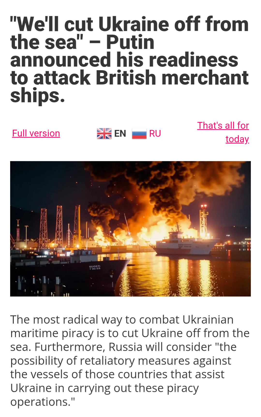 Putin responds to the news of an attack on a Russian commercial ship in the black sea today:>"Attacks on tankers in neutral, or even non-neutral, waters, but in the special economic zone of another state, a third state, are piracy. Nothing else. So, they, the Ukrainian armed forces, previously attempted to strike our seaports. We responded. We responded precisely. We did not initiate these operations with similar strikes.>"I assure you they are far more effective and powerful. This primarily concerned the vessels and ships that delivered military supplies, equipment, and ammunition to Ukraine. And we got exactly where we wanted,">"If this continues, we will consider retaliatory measures against the vessels of those countries that assist Ukraine in these piracy activities. The most radical option is to cut Ukraine off from the sea, which will make piracy impossible. It's all escalating,"It's all escalating indeed