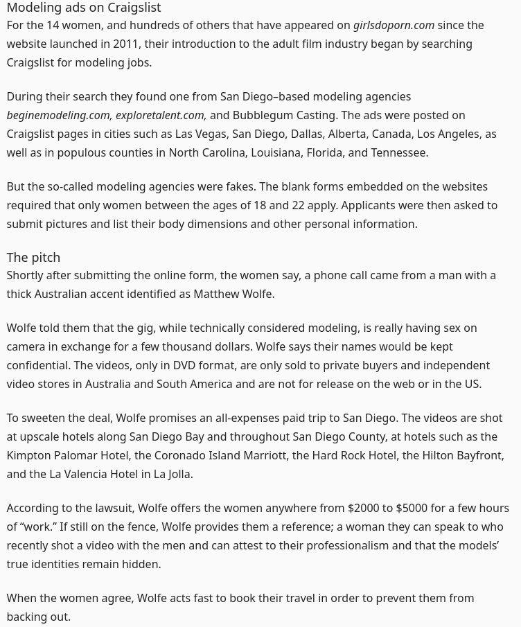 >>522791291They knew they were having sex on camera for money before they even got on the plane. The only reason the producers got punished is for lying about distribution and paying a girl to vouch for the company (i.e. fraud)