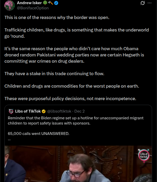 >>522792546Human trafficking is the third most profitable criminal enterprise on the planet and 80% of the profit is sex trafficking. The most profitable of that being child sex trafficking.